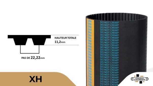 Les courroies XH sont définies par un pas de 22,225 mm (soit 7/8"), ce qui les classe parmi les profils à denture large, parfaitement adaptés aux fortes sollicitations mécaniques. Fabriquées à base de caoutchouc chloroprène renforcé, elles intègrent des câbles en fibre de verre pour une excellente stabilité dimensionnelle.