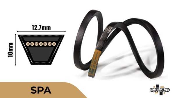 La section SPA (12,7 mm de largeur × 10 mm de hauteur) respecte la norme DIN 7753 / ISO 4184, garantissant une géométrie standardisée et compatible avec les poulies SPA. La longueur primitive Ld est de 2532 mm (longueur extérieure autour de 2550 mm suivant les fabricants), conforme aux dimensions courantes du marché. Le revêtement extérieur en tissu gainé protège contre l’abrasion, tandis que le mélange de caoutchouc synthétique offre une excellente résistance thermique et à l’huile .